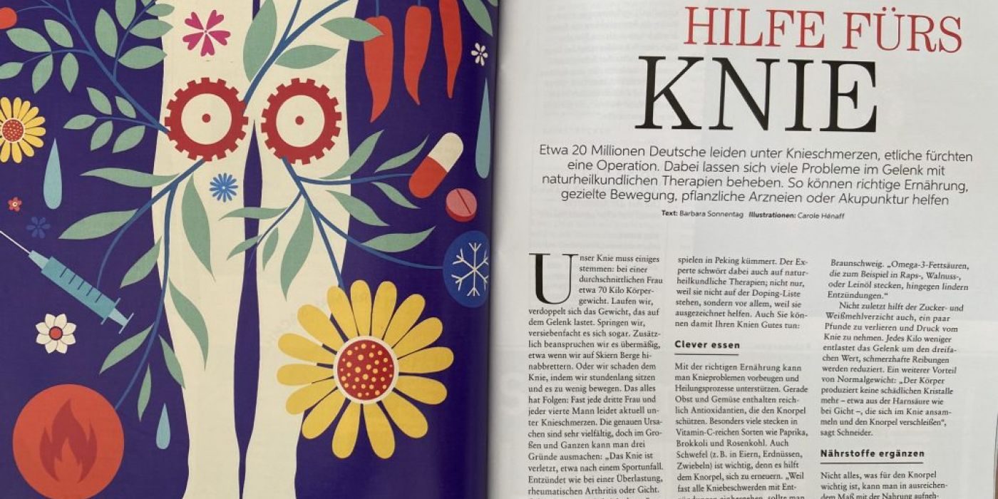 Lesen Sie in der „freundin“ zahlreiche Tipps von Dr. Christian Schneider zu natürlicher Hilfe bei Kniebeschwerden durch Ernährung, gezielte Bewegung und pflanzlichen Verfahren (Ausgabe 4/22, vom 26.01.22, S. 79ff).